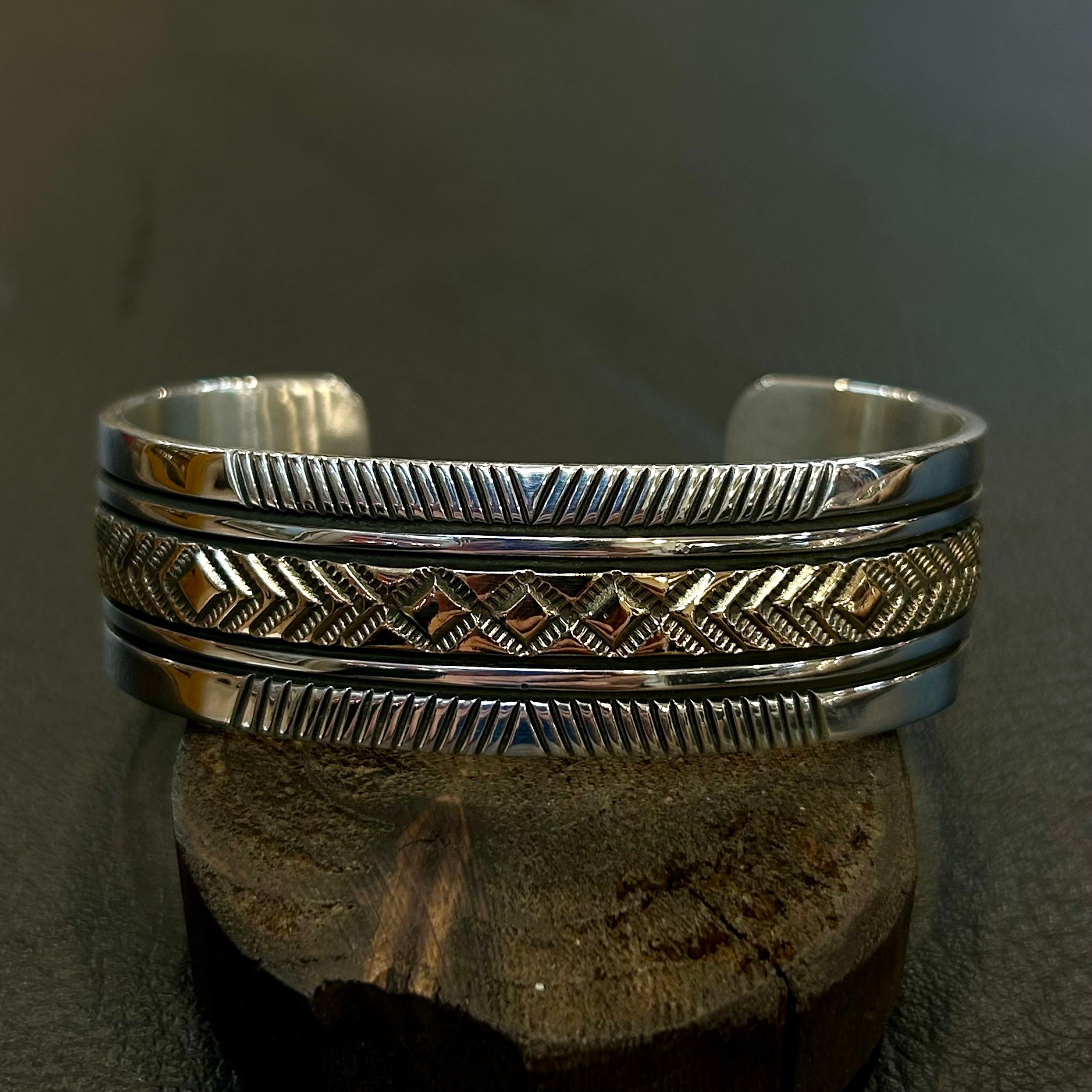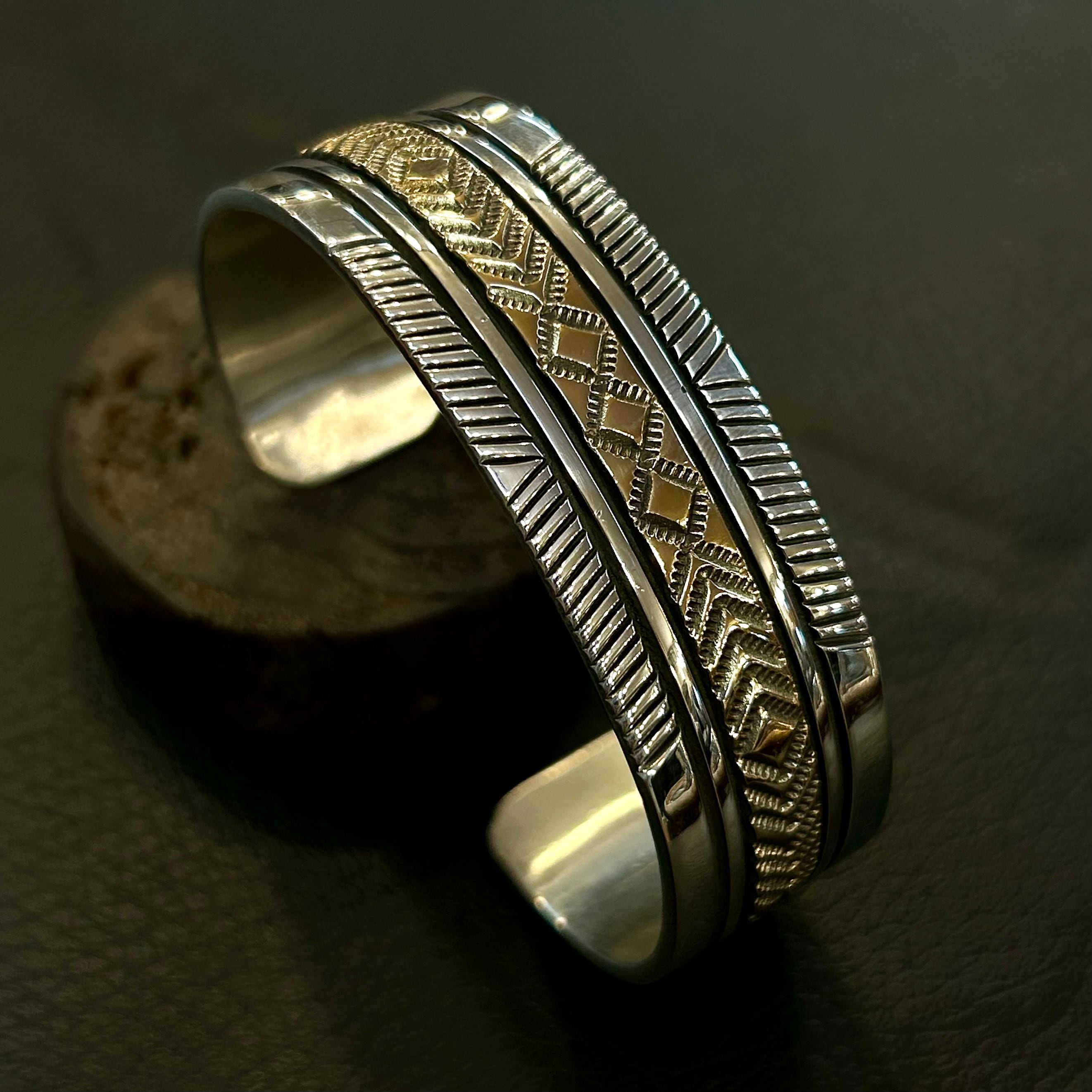 ナバホ族を代表するアーティストブルース・モーガンさんによる、シルバーとゴールドの美しいコントラストが際立つバングルです。