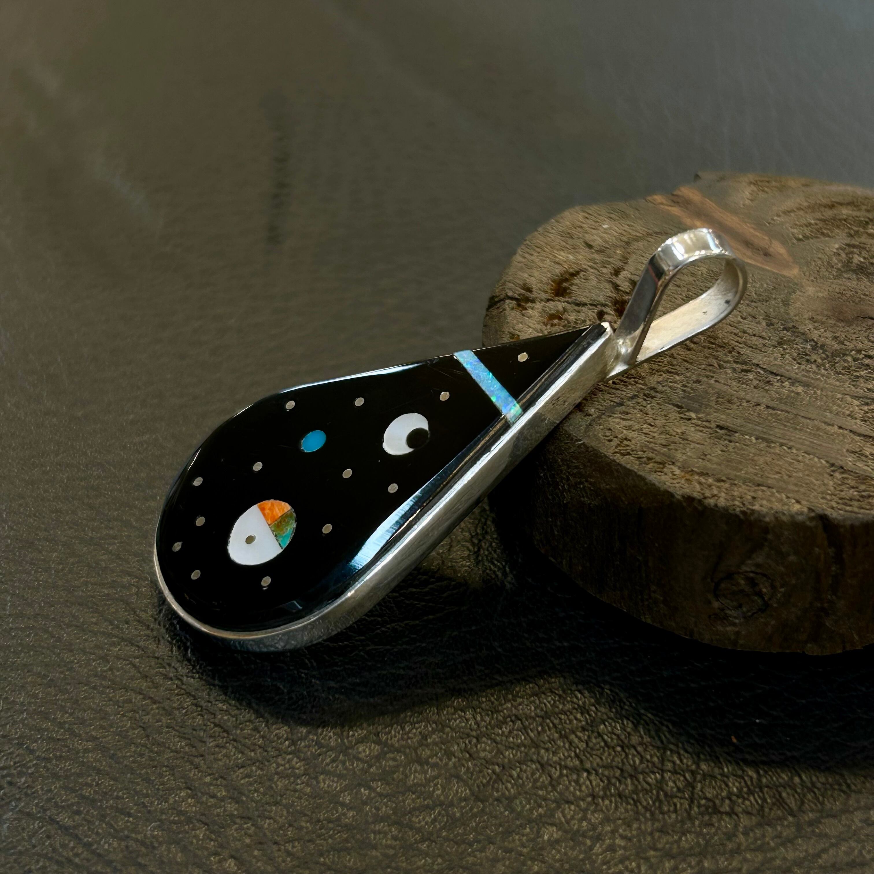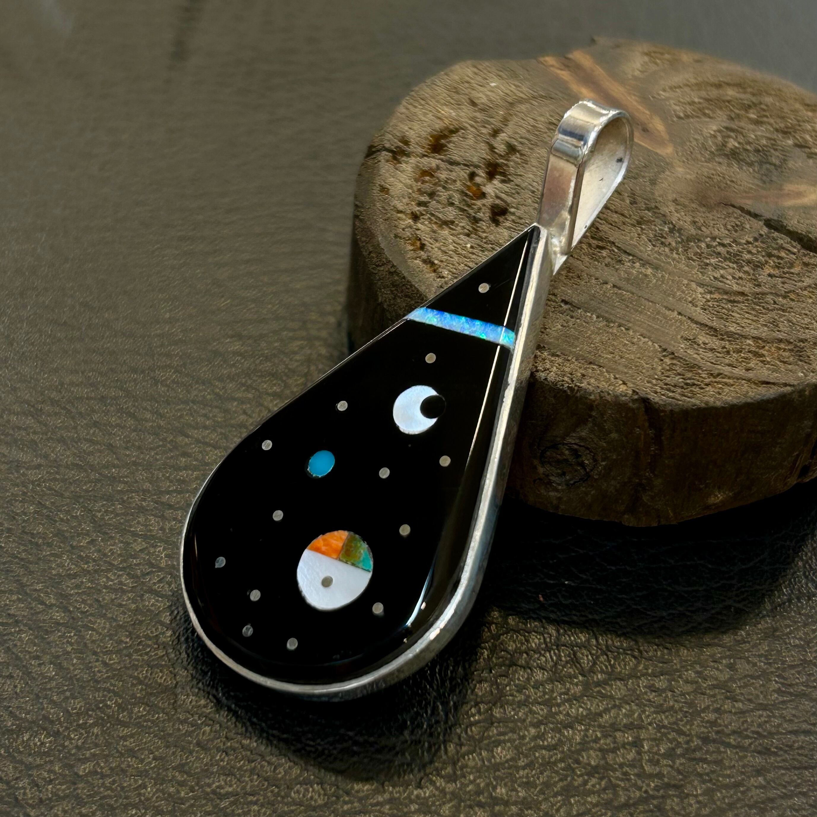 漆黒のオニキスをベースに、ターコイズ、オパール、マザーオブパール、スパイニーオイスターなどの天然石を巧みに組み合わせ、夜空に浮かぶ 月・星・惑星 を表現。滴型のフォルムの中に広がる宇宙は、まるで無限の時を感じさせるかのような静謐さと神秘を宿しています。