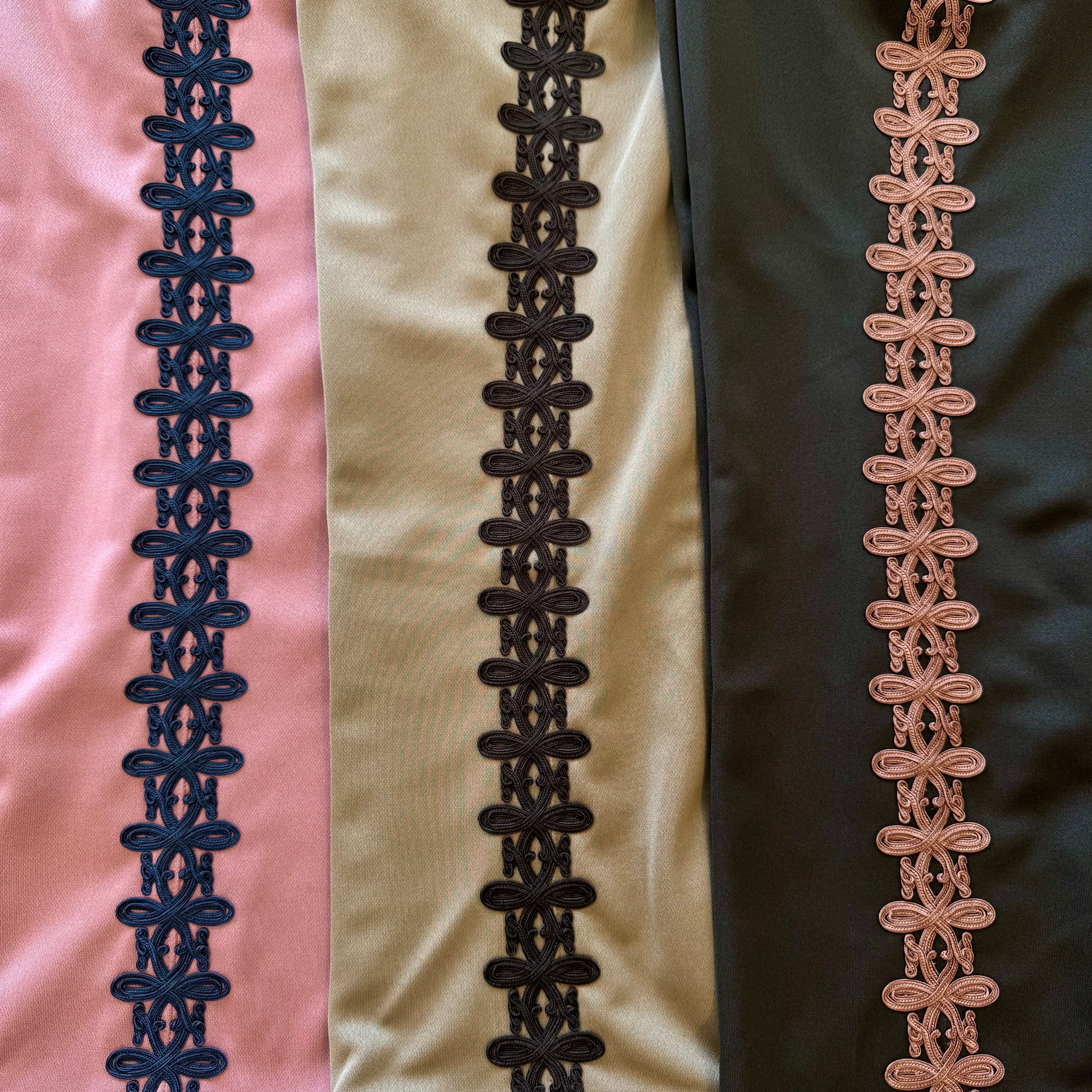 最大の魅力は、サイドに施された存在感抜群のコード刺繍。
