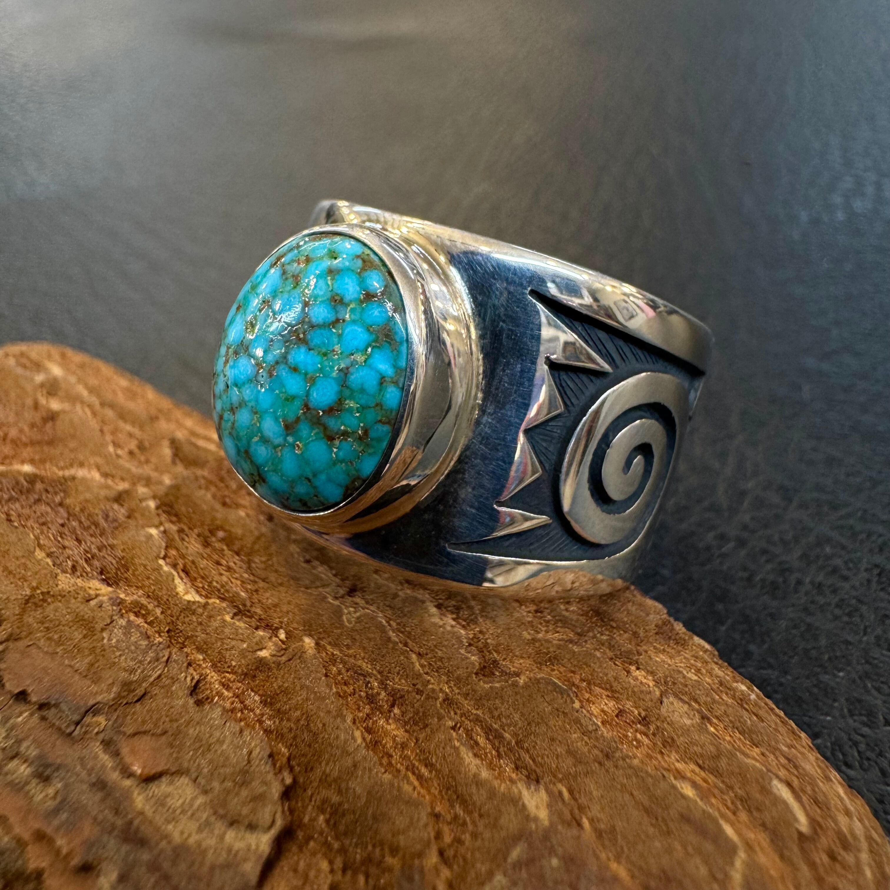 そして、彼の作品の中でもひときわ存在感を放つのが、キングマンターコイズをあしらったウェーブデザインのリング。