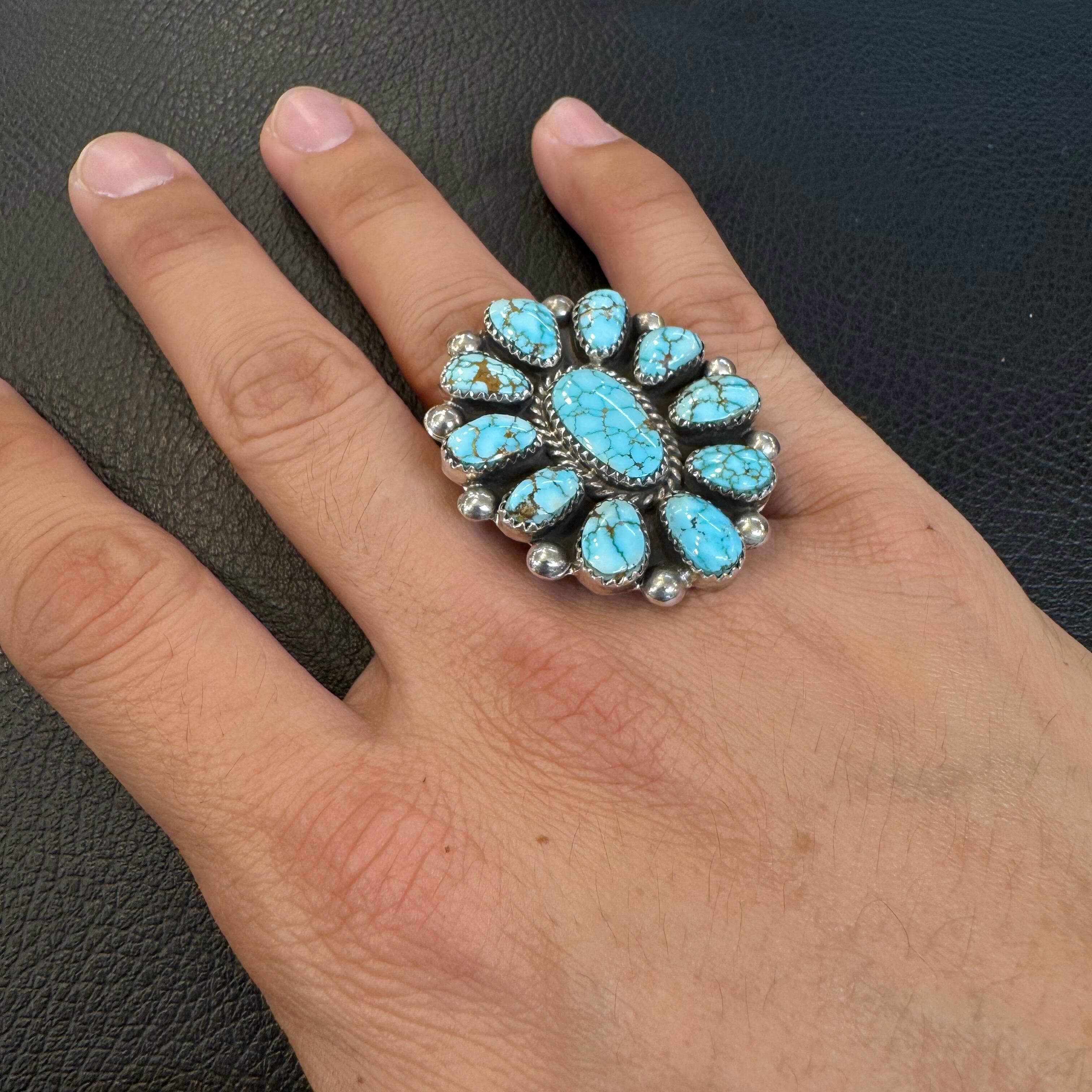No.8ターコイズを贅沢に11石も使用した迫力のあるクラスターリングです。