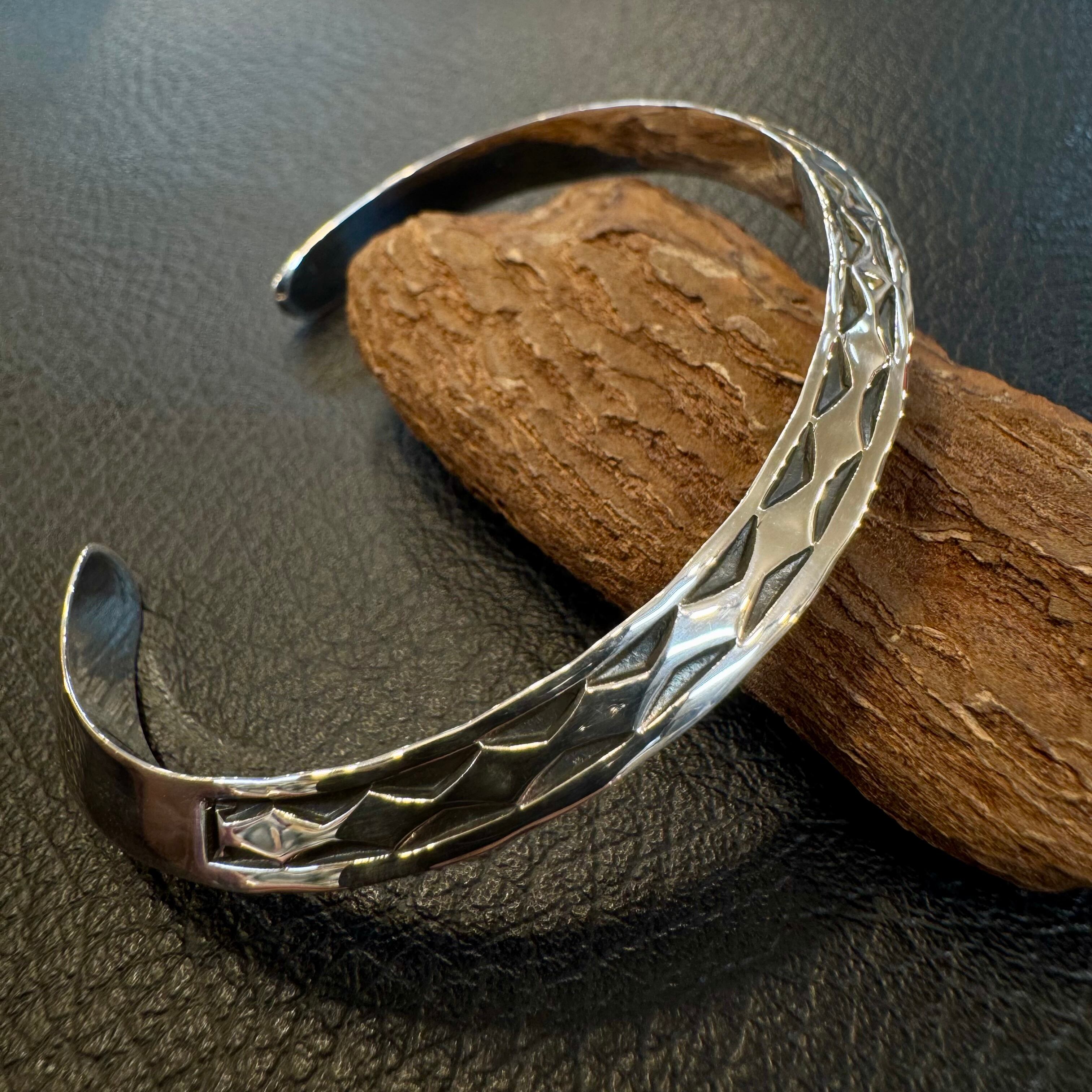 厚みのあるヘビーゲージシルバーに打ち込まれた模様は、