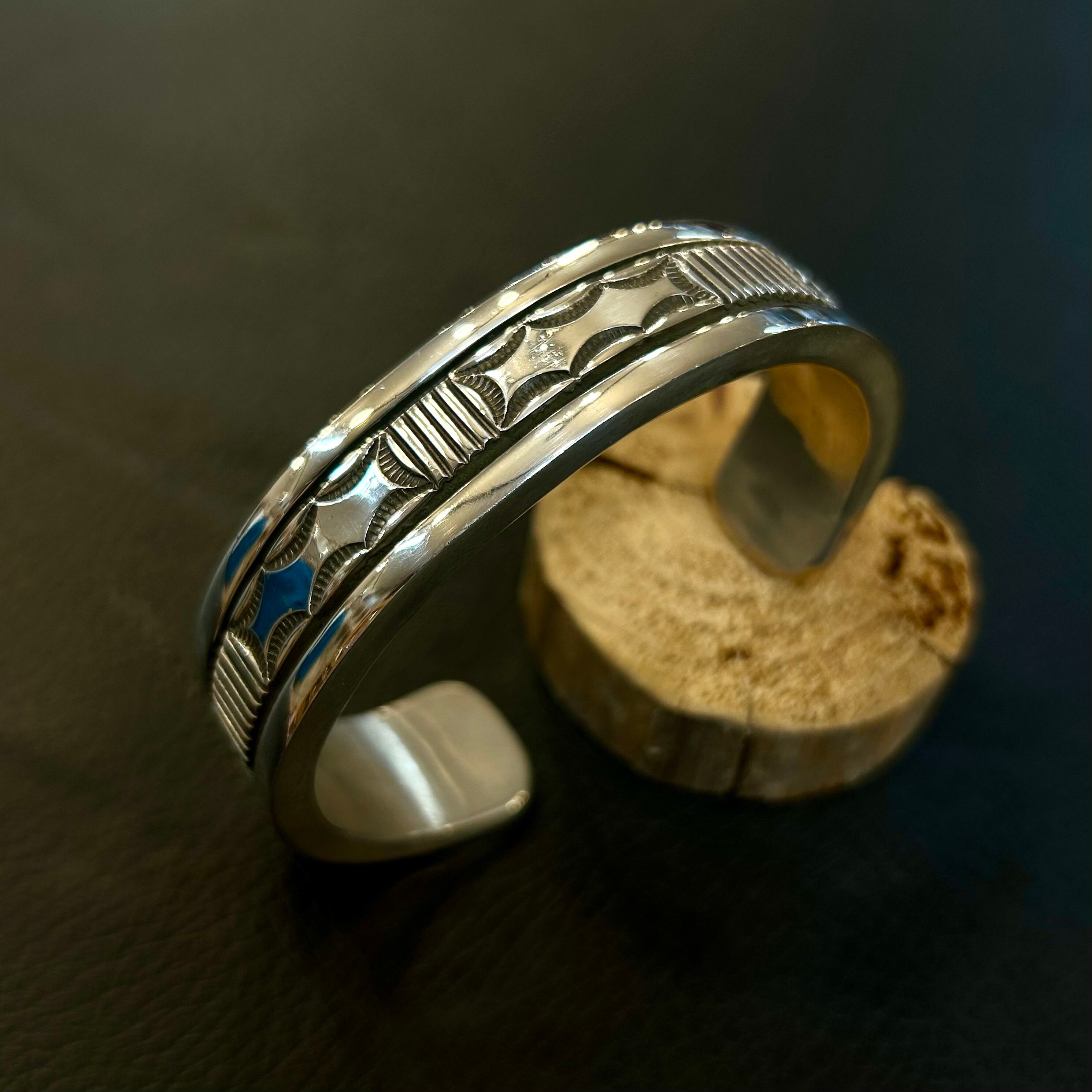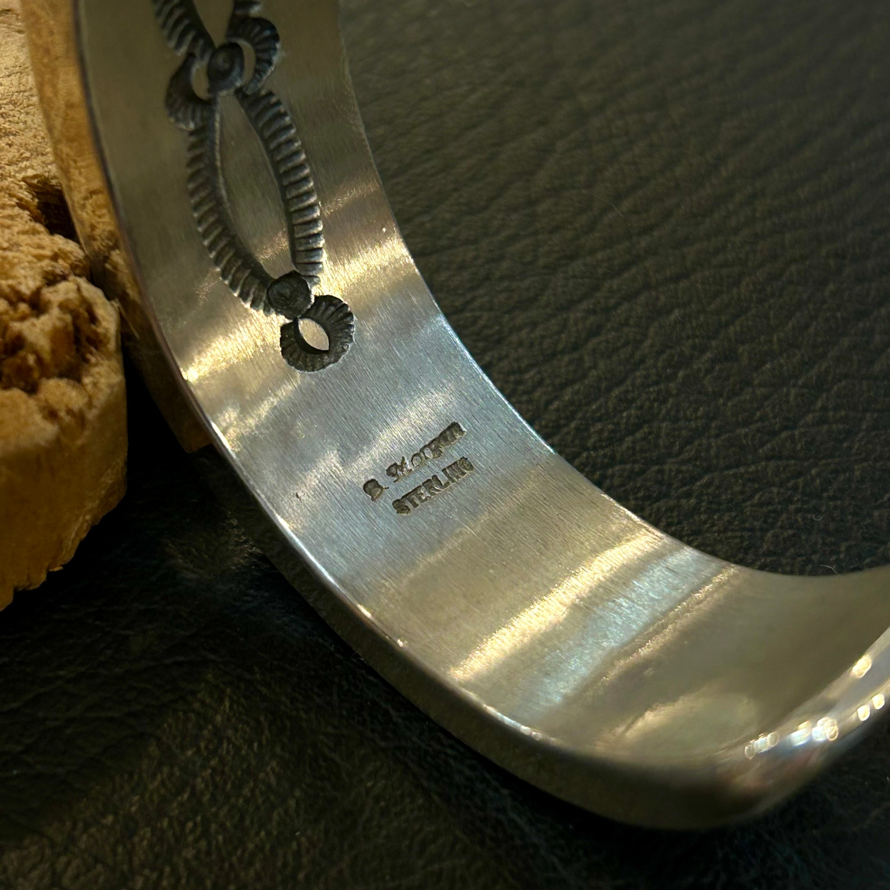 重厚なヘビーゲージシルバーに、迷いのないスタンプワークを打ち込むことで知られる、ナバホジュエリー界を代表するアーティストの一人です。