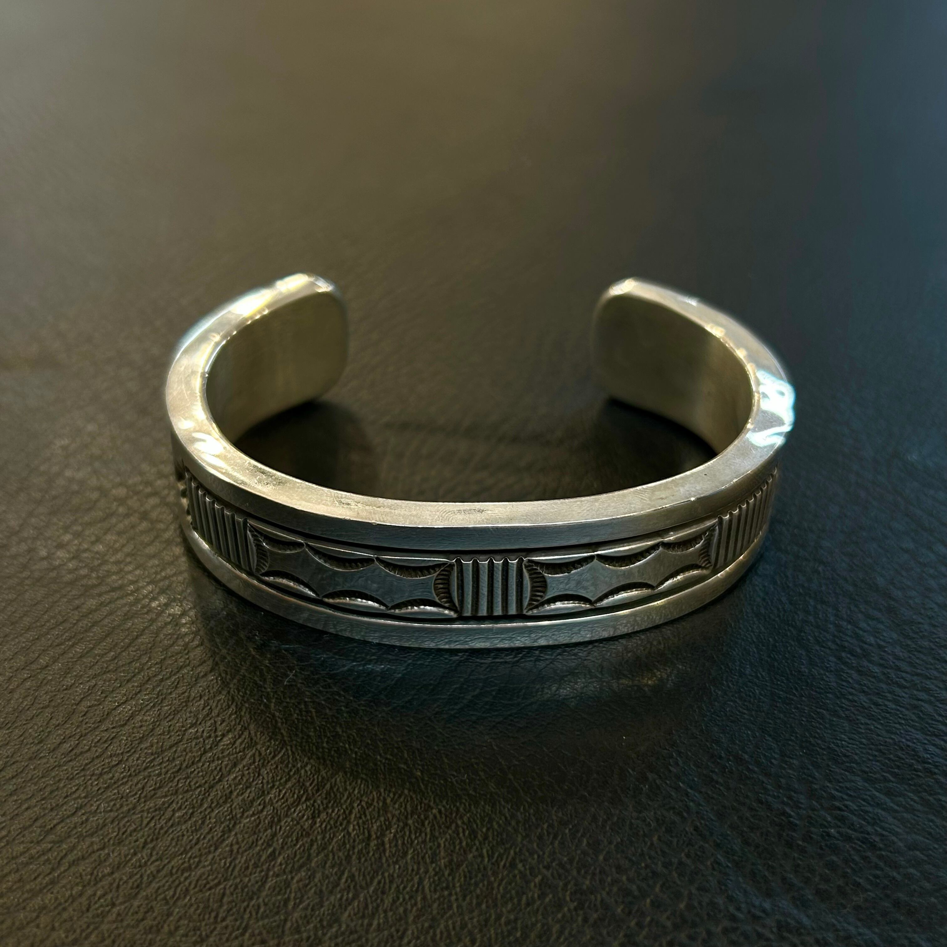 ナバホ族を代表するアーティストブルースモーガン(Bruce Morgan)さんによる、シルバーのヘビーゲージスタンプワークバングルです。