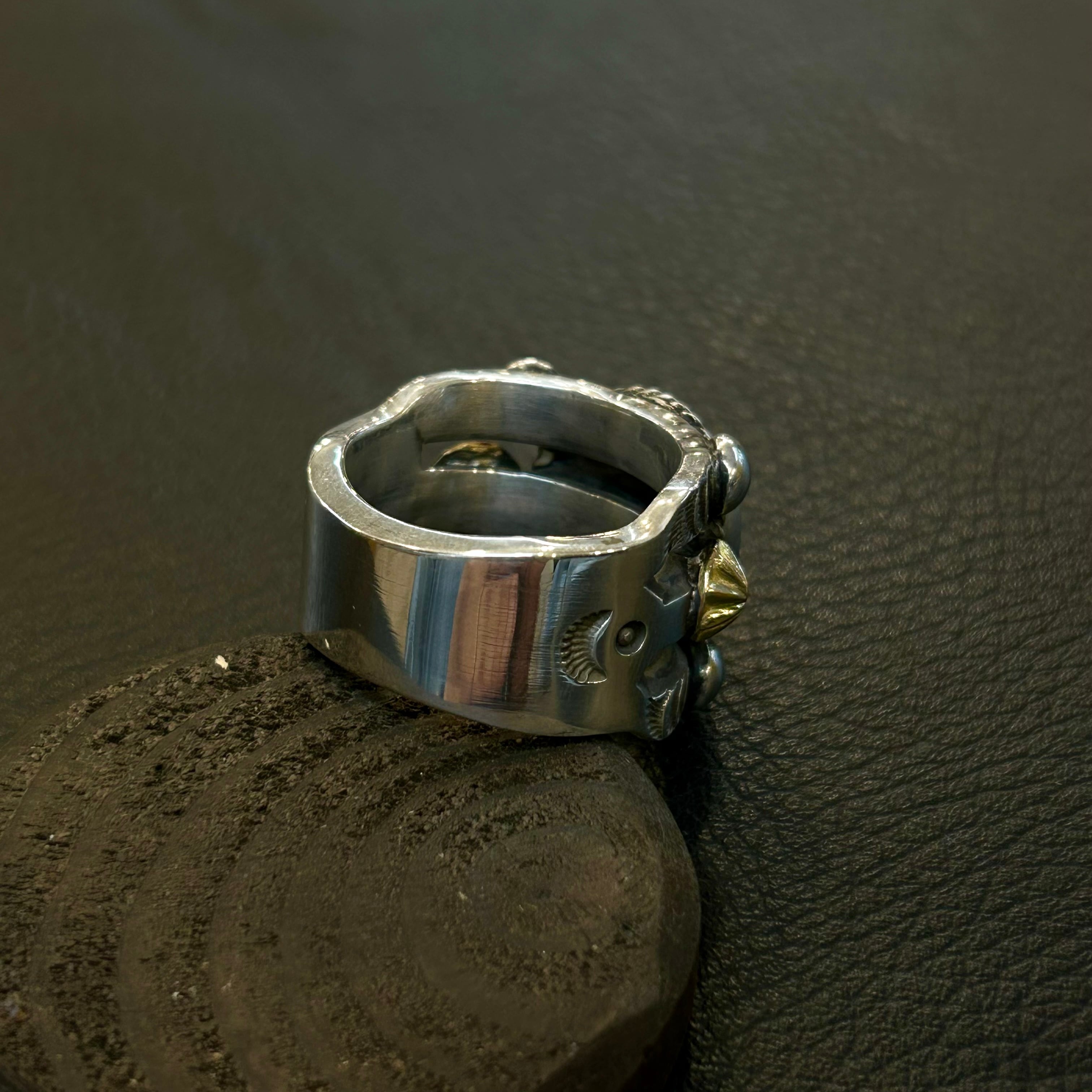 石の両サイドには18Kゴールド製のコンチョを配置。