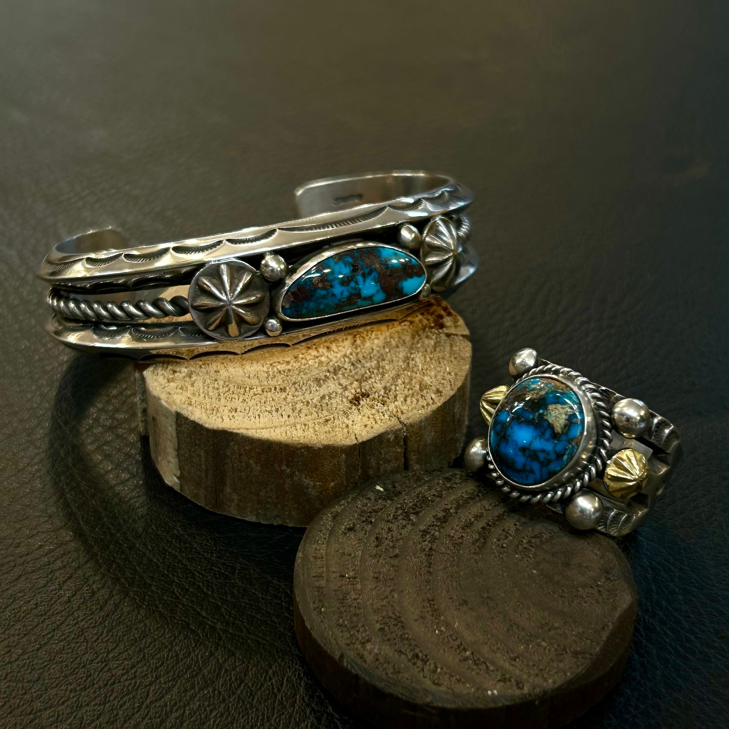 センターには、深みのある発色とマトリックスが美しいハイグレードなビズビーターコイズを使用。