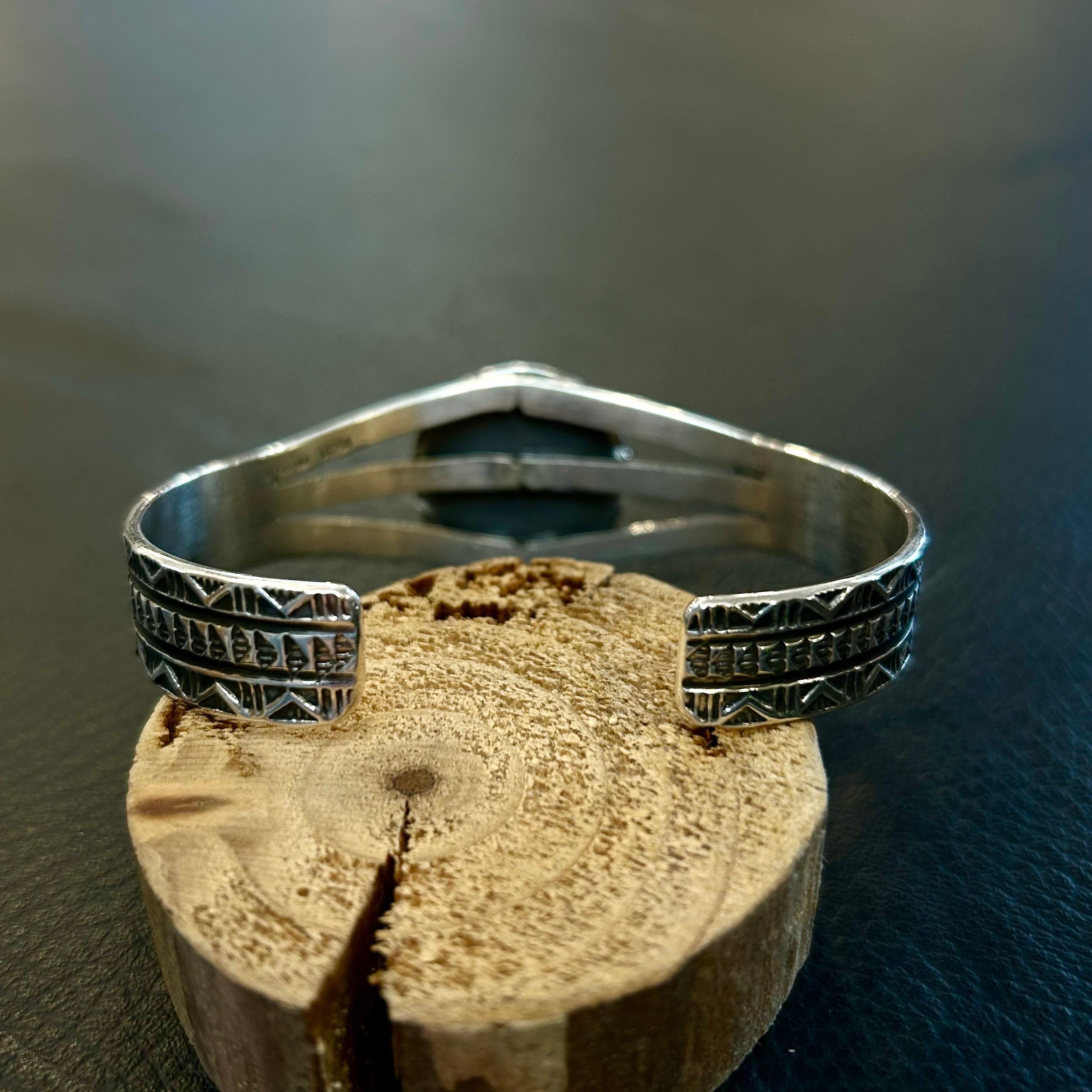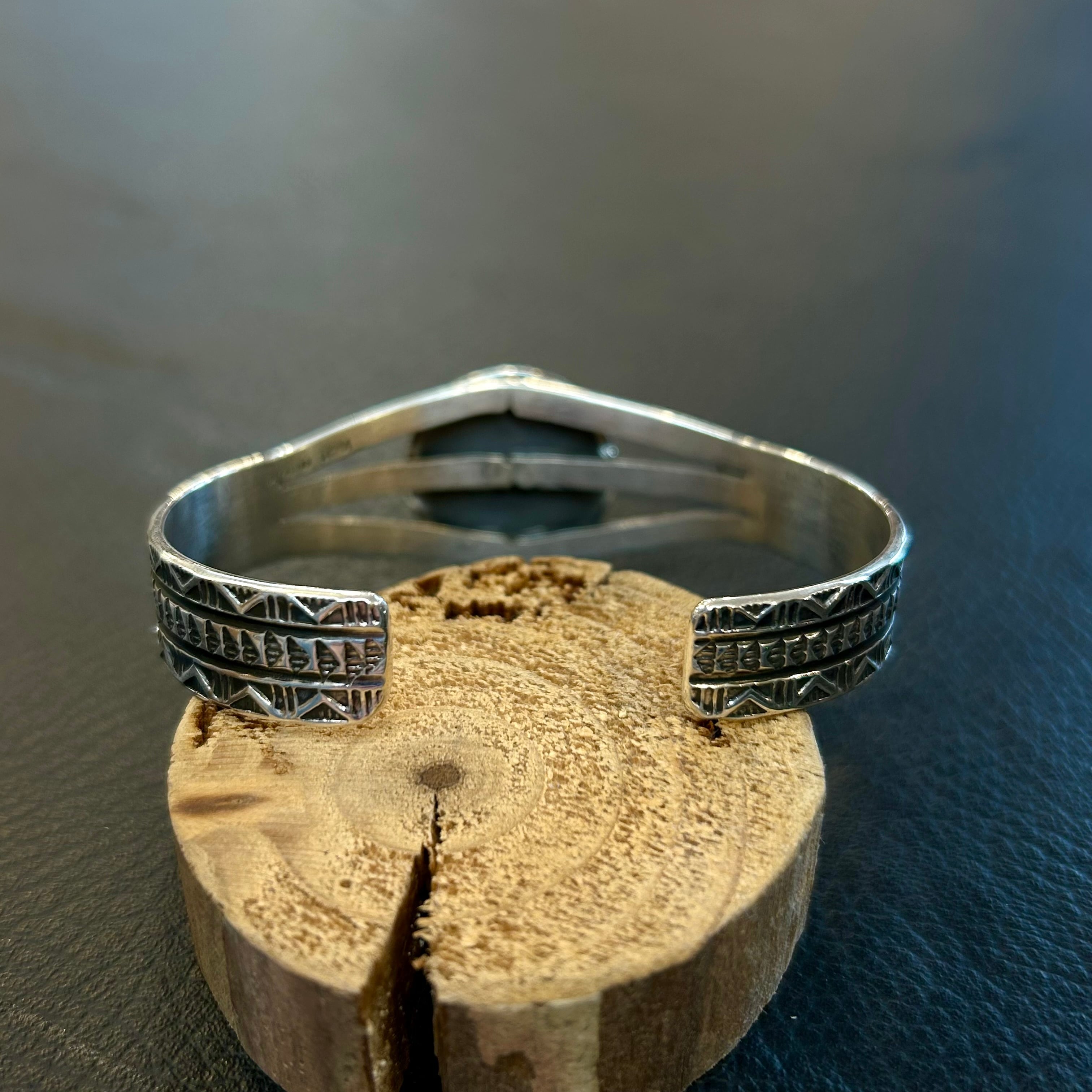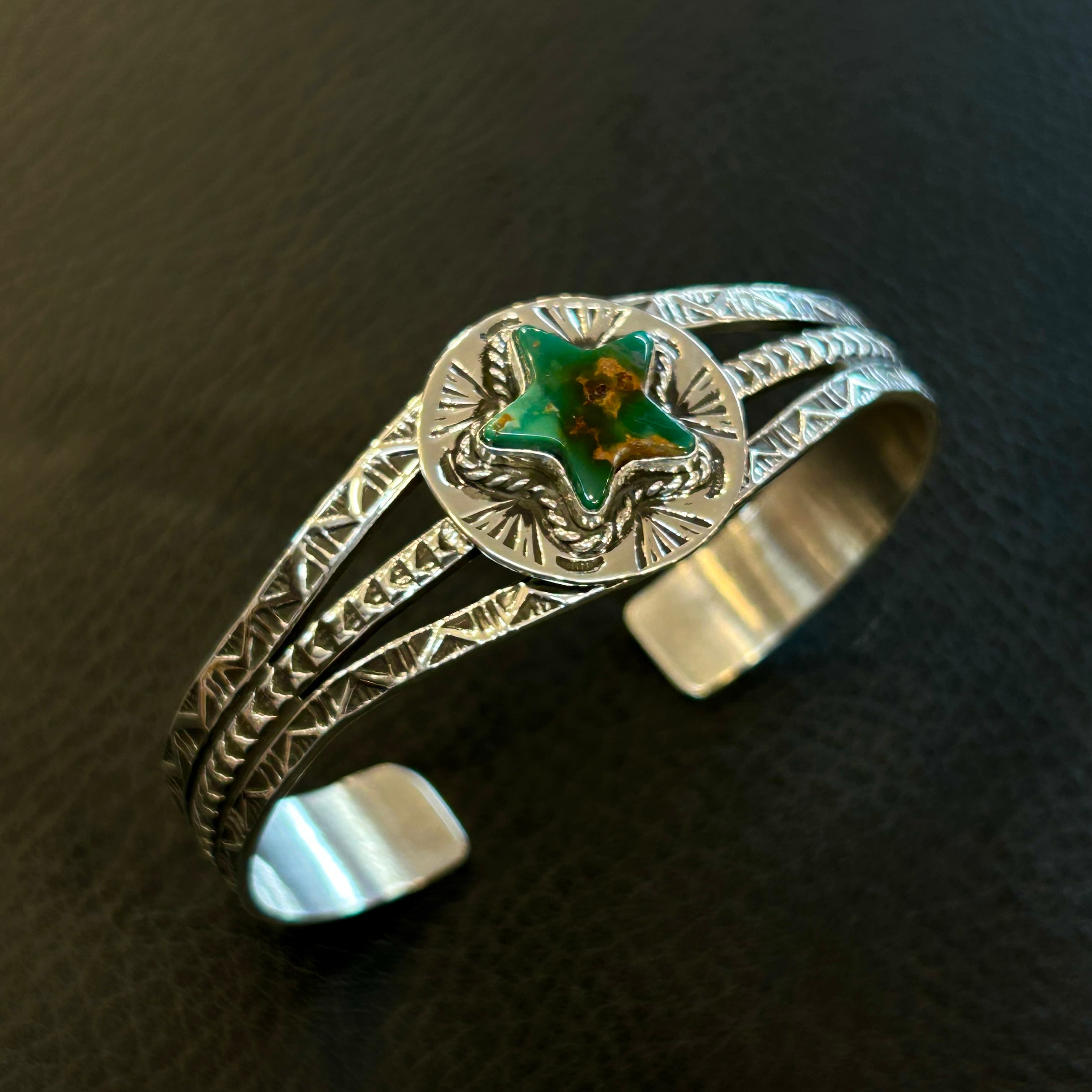 ナバホ族ヘンリーマリアーノさんが制作したロイストンターコイズを使用したスタンプワークバングル。