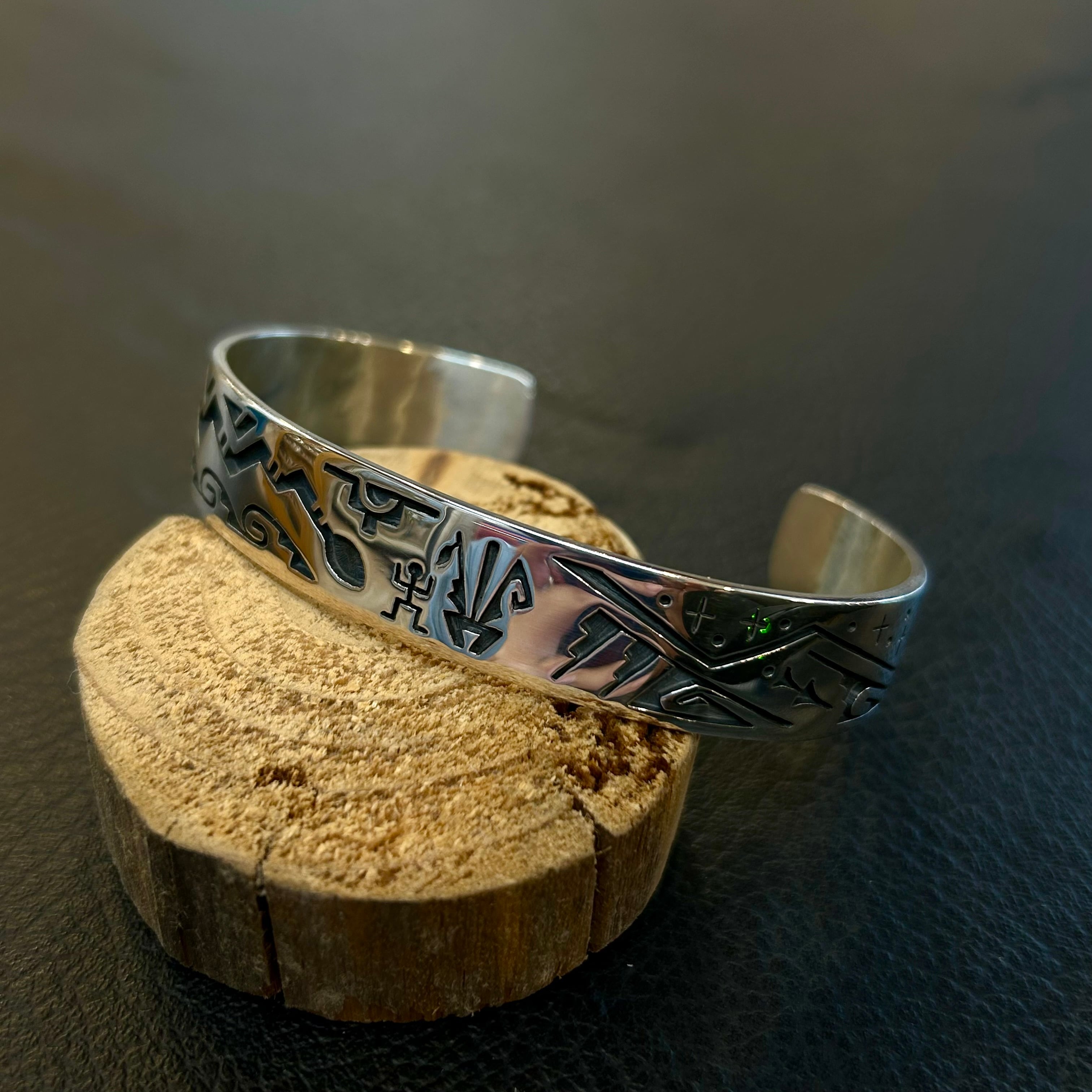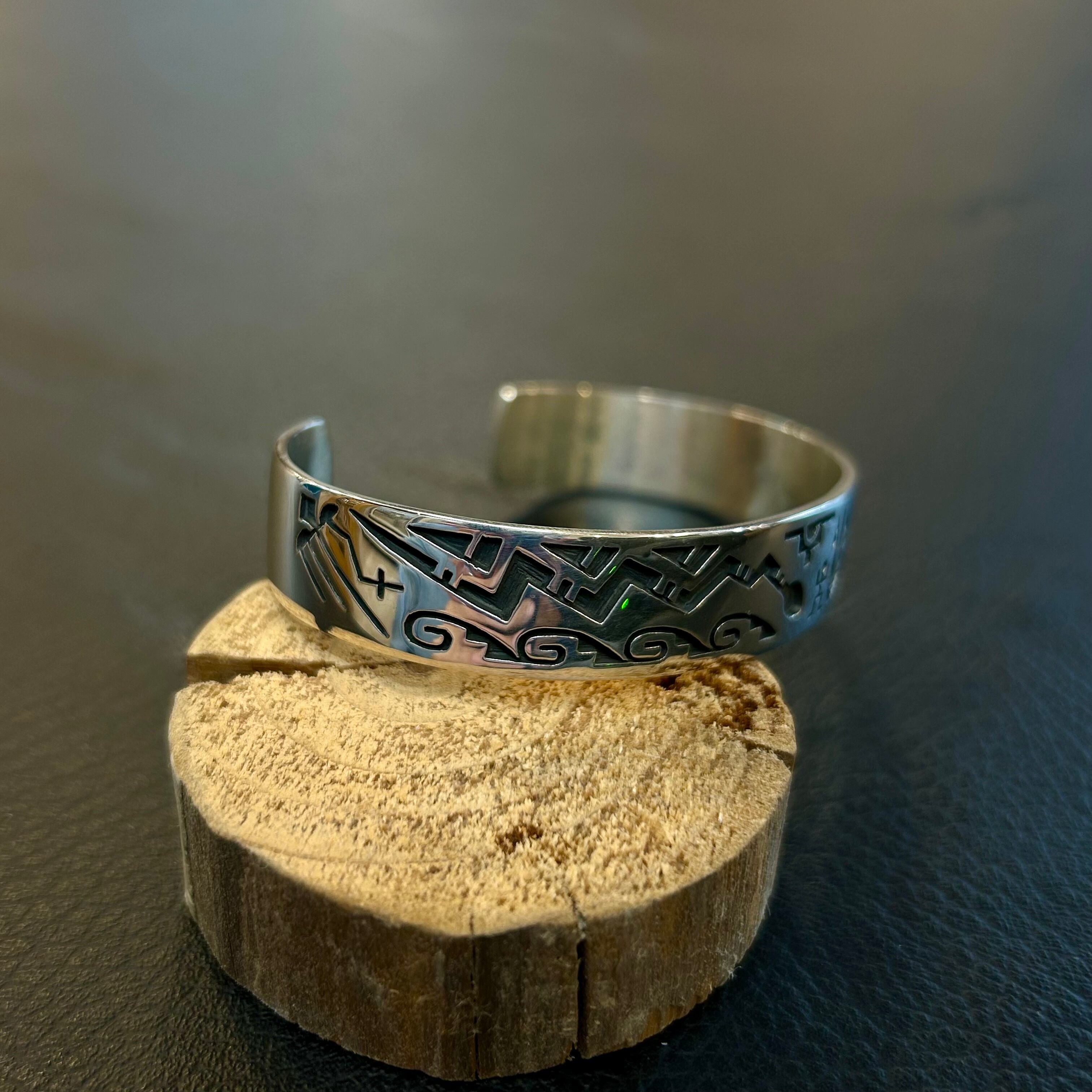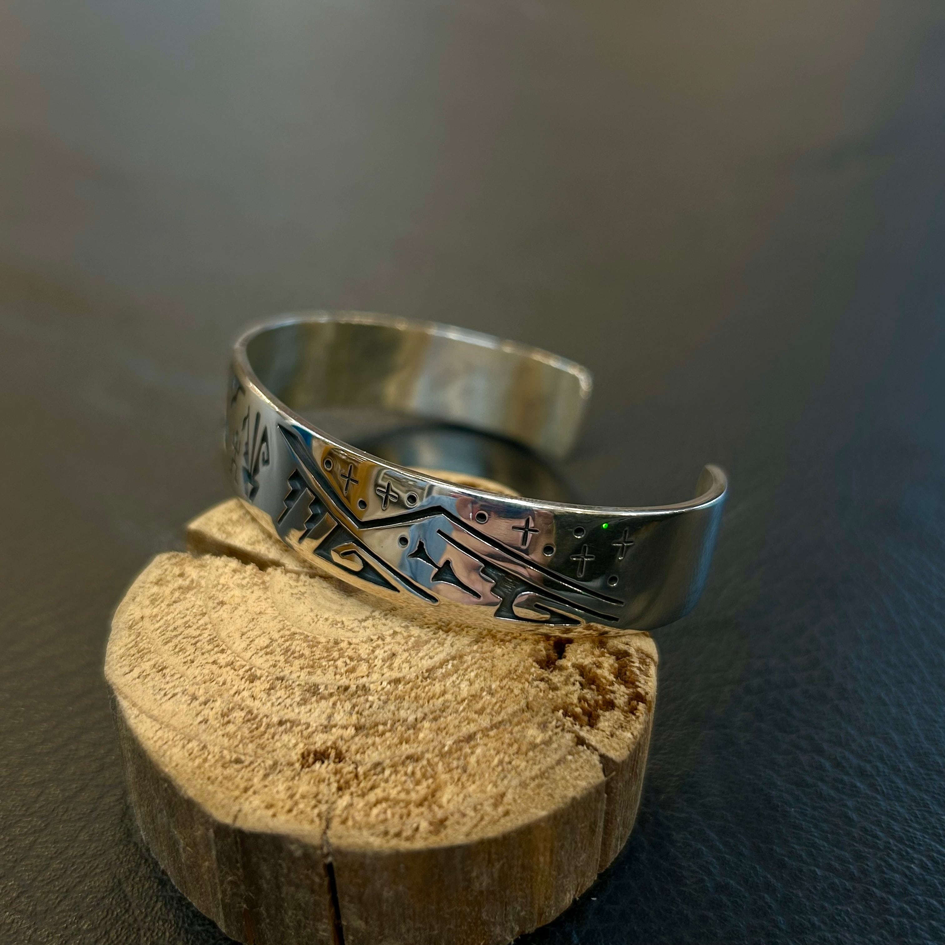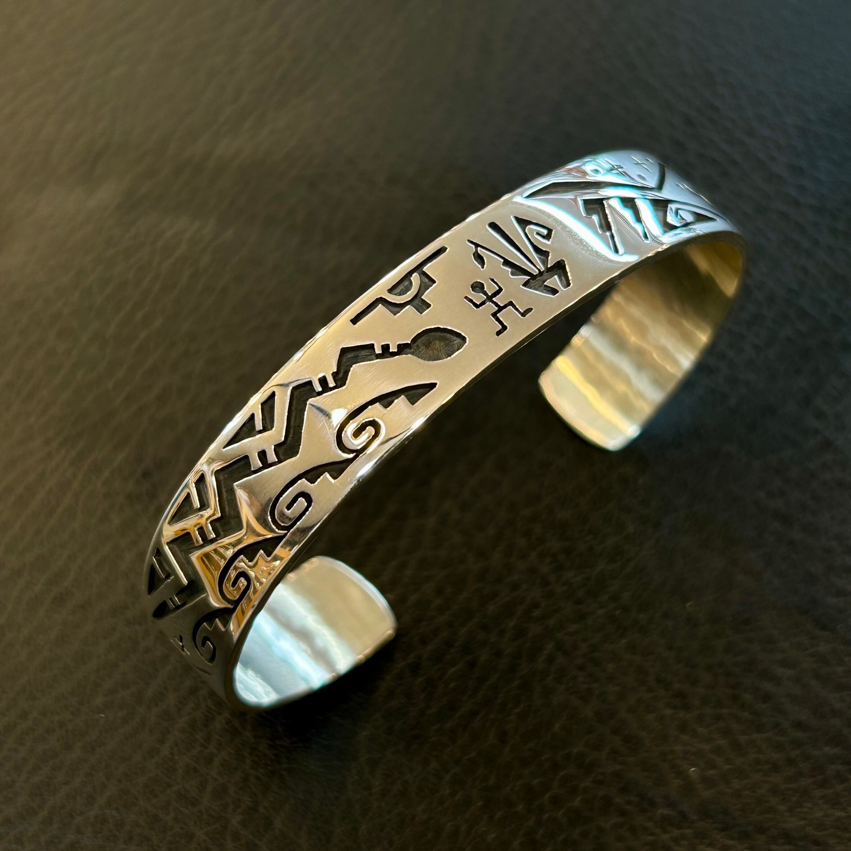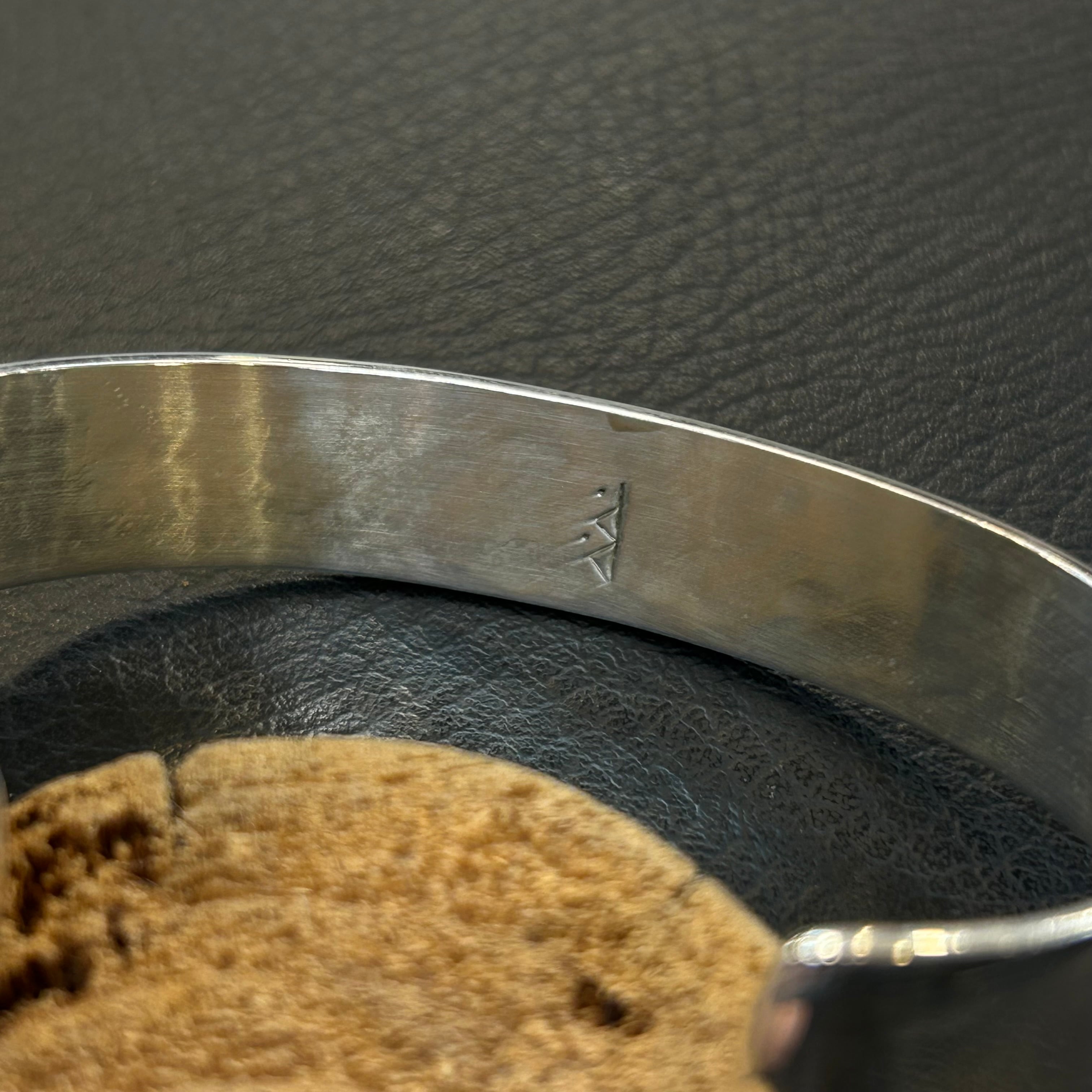 ホピ族のベテランアーティスト、ドロシー・キャセユシーによるスタンプワークバングル。比較的小ぶりな作品を多く手がける彼女ですが、その中には高い技術と独創的な感性が凝縮されています。