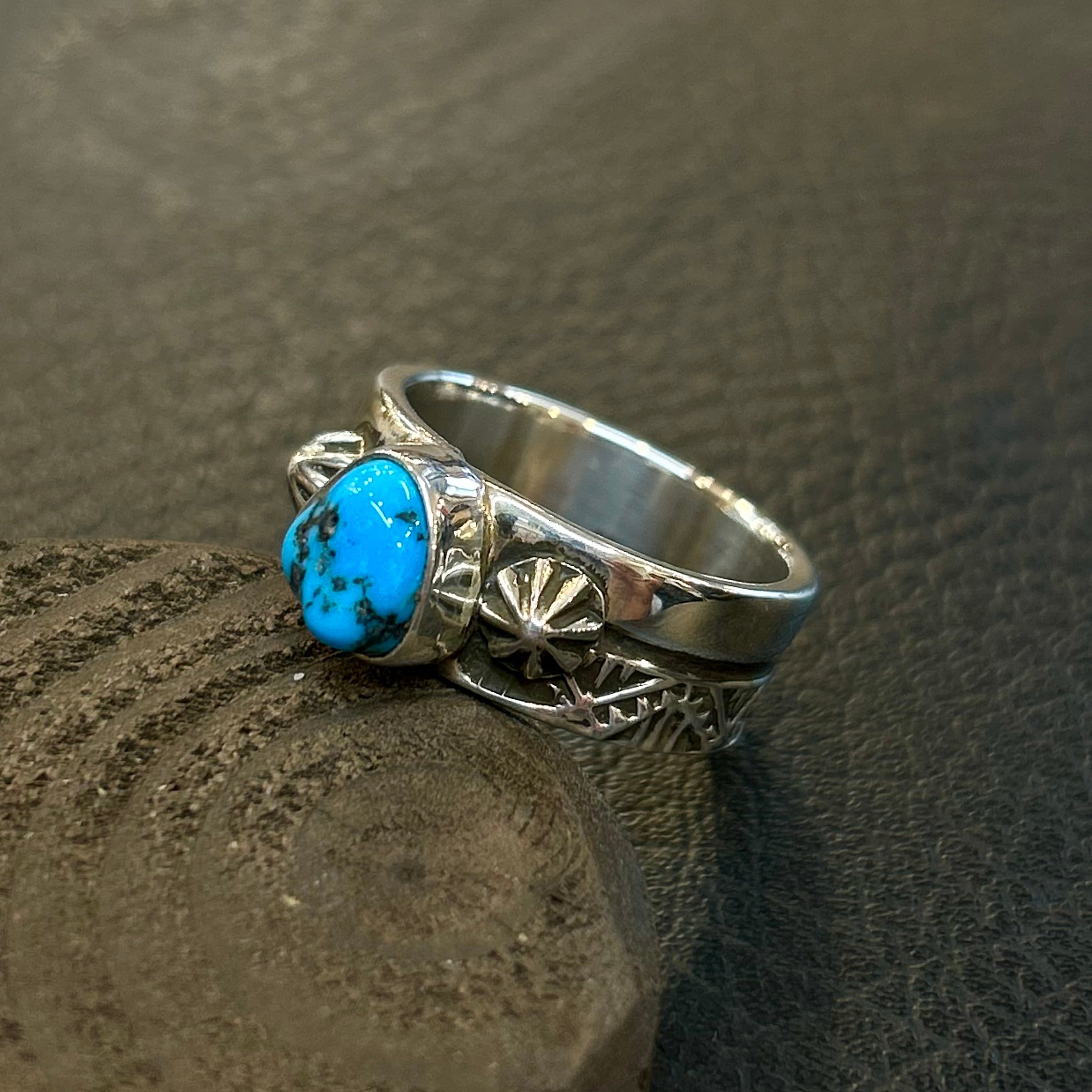 ナバホ族ヘンリーマリアーノさんが制作したキングマンターコイズを使用したスタンプワークリング。