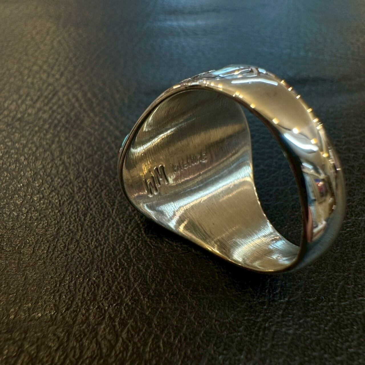 緻密にカットされたパーツが生み出す美しいコントラストは、思わず見入ってしまう完成度。カレッジリングのようなクラシックな雰囲気を持ちながら、どこかアートピースのような存在感を放ちます。
