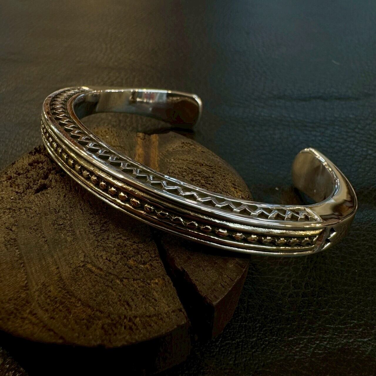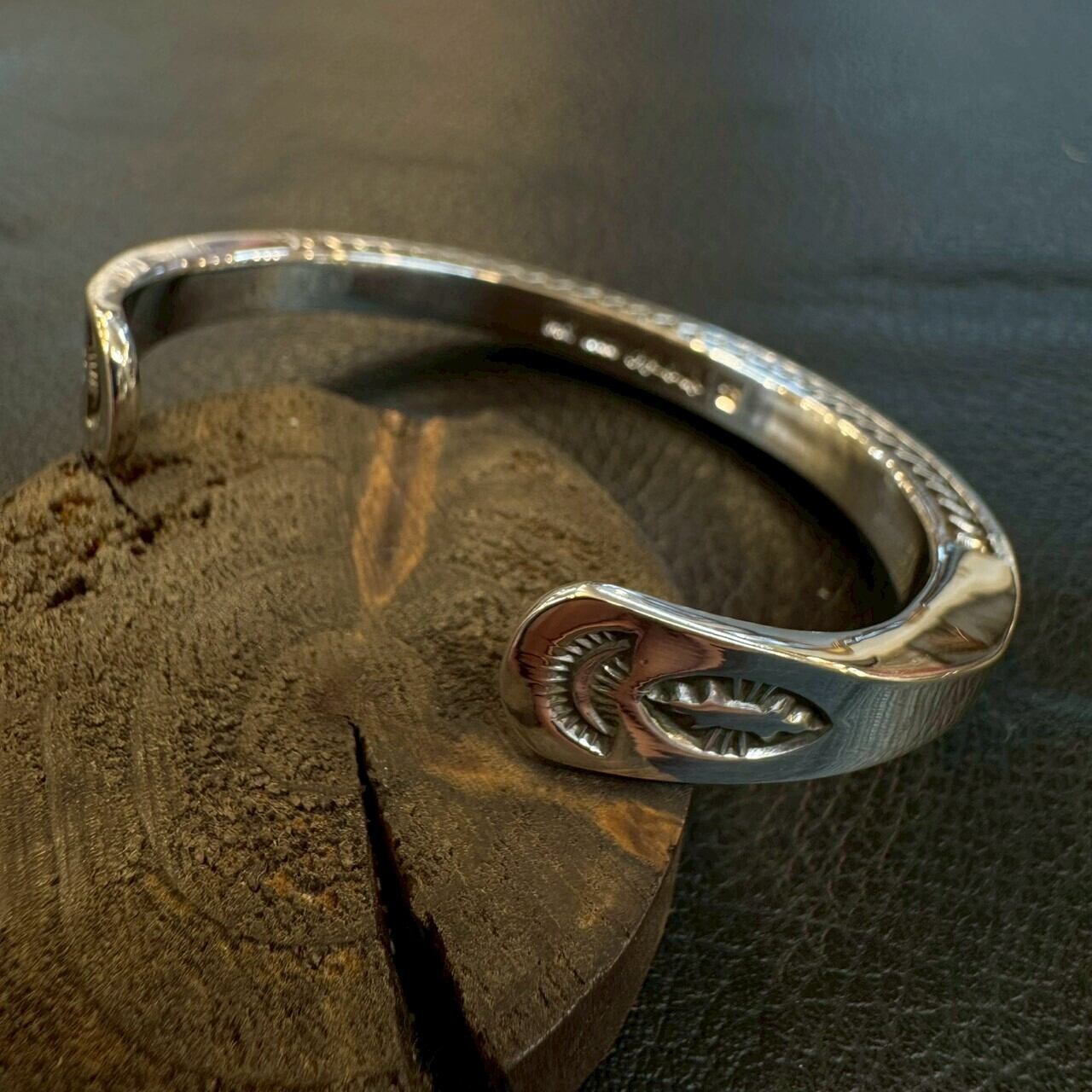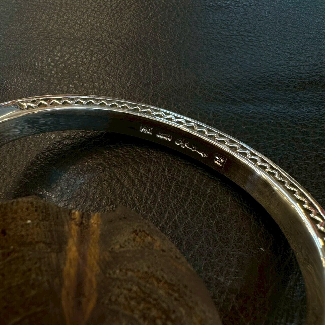 このバングルは、厚みのあるシルバーに、3面すべてへ施された精密なスタンプワークが特徴。