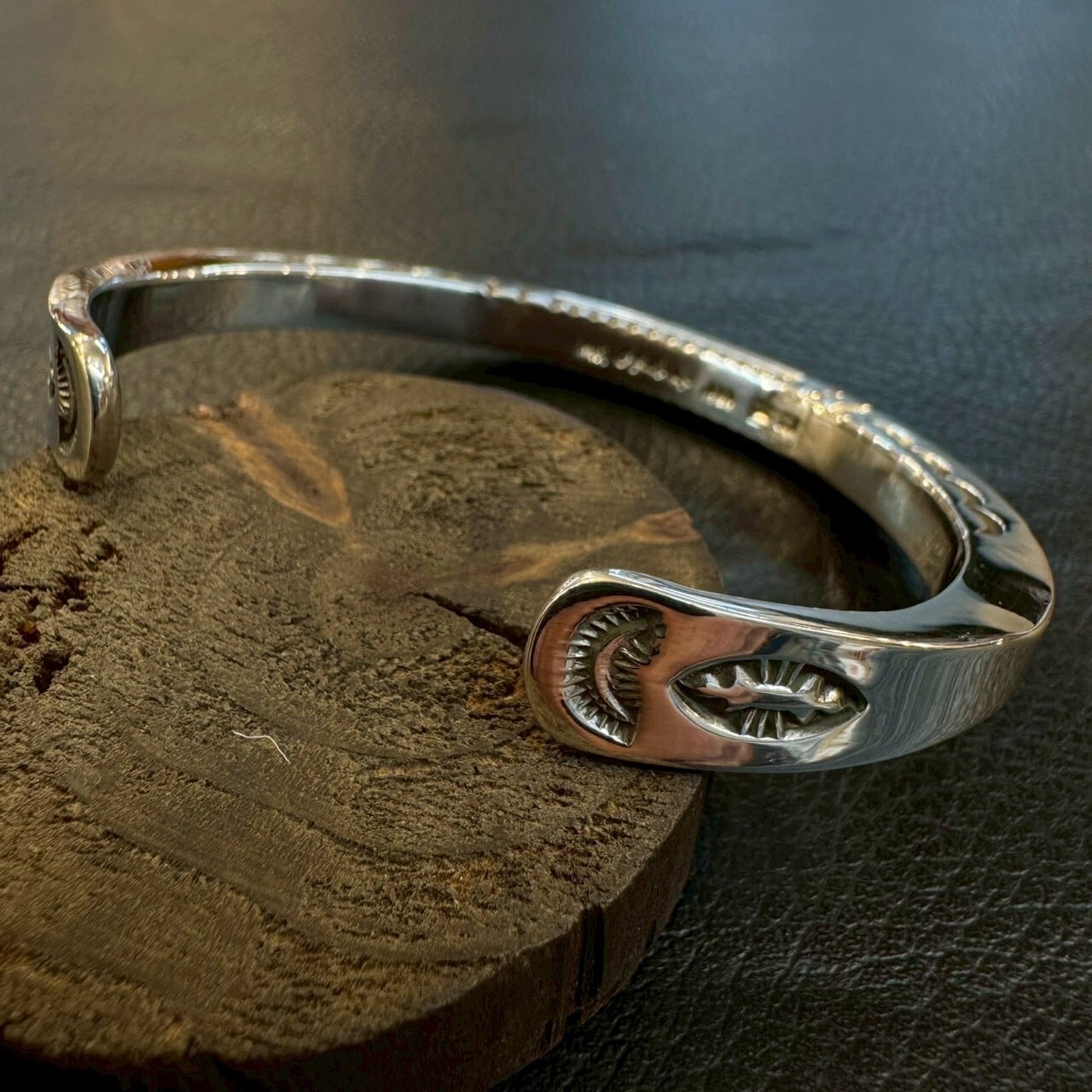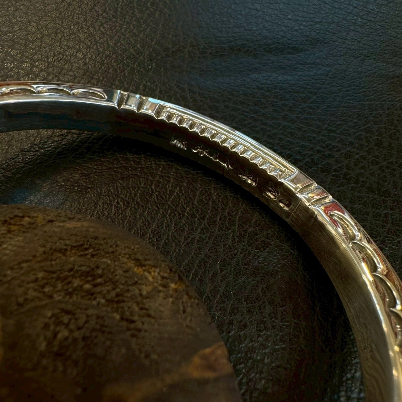 このバングルは、厚みのあるシルバーに、3面すべてへ施された精密なスタンプワークが特徴。