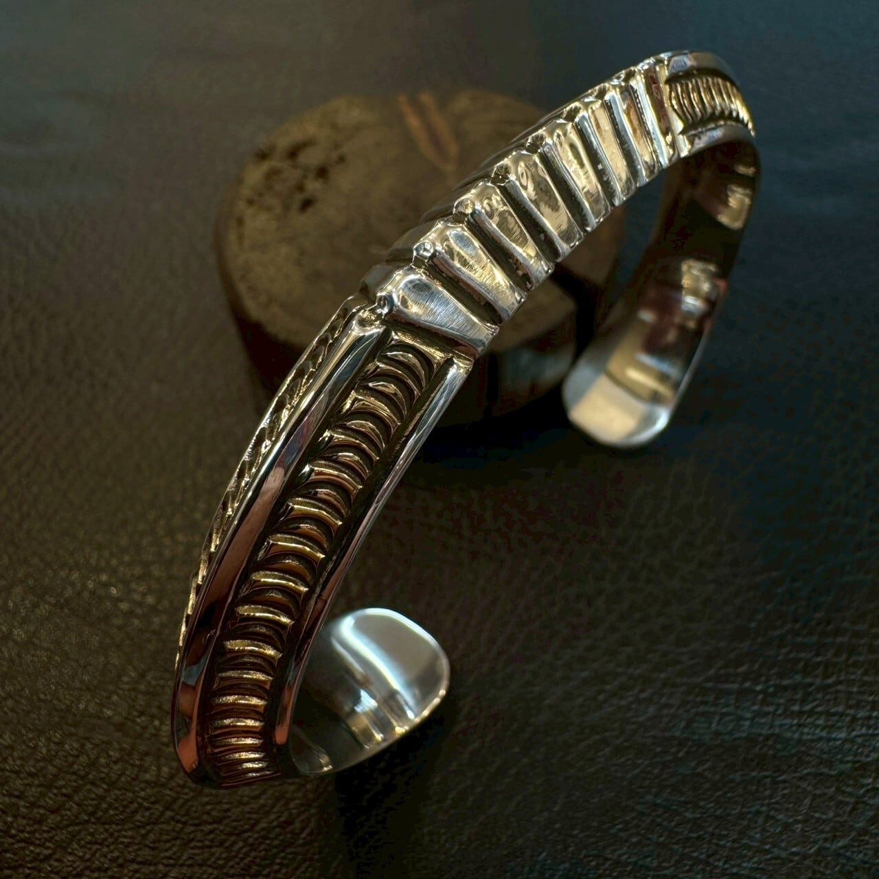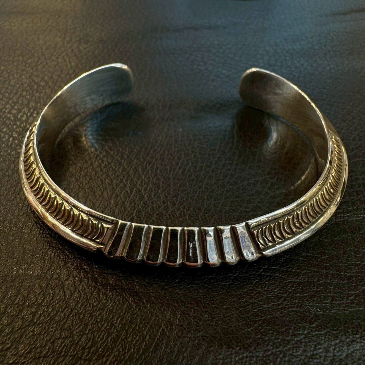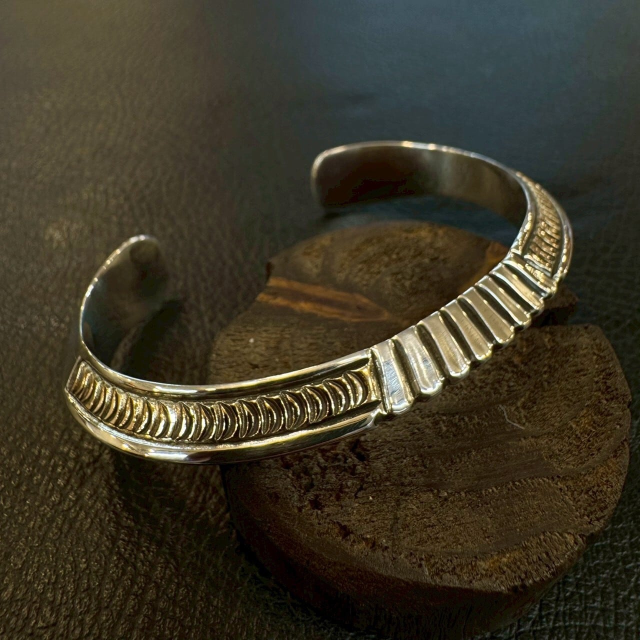 ナバホ族の若手実力派アーティスト、ライルセカテロ(Lyle Secatero)による14Kトライアングルスタンプワークバングル。