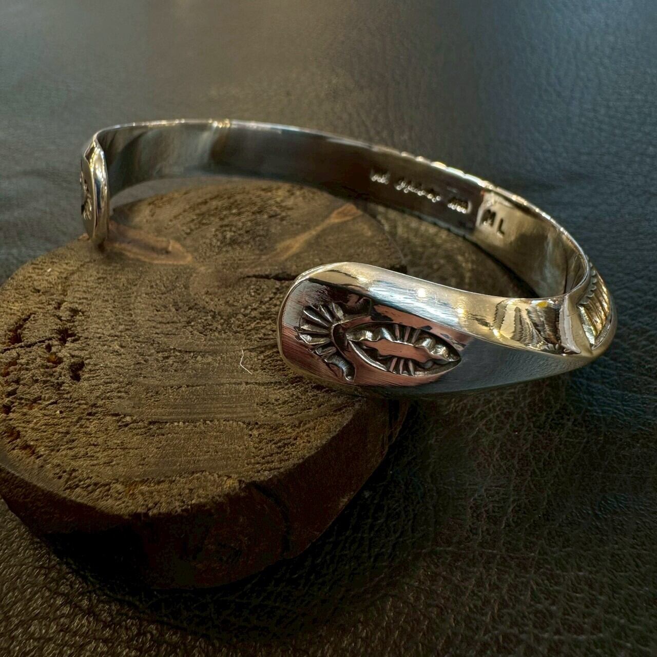 このバングルは、厚みのあるトライアングル形状のボディに、緻密で美しいスタンプワークが施された一本。
