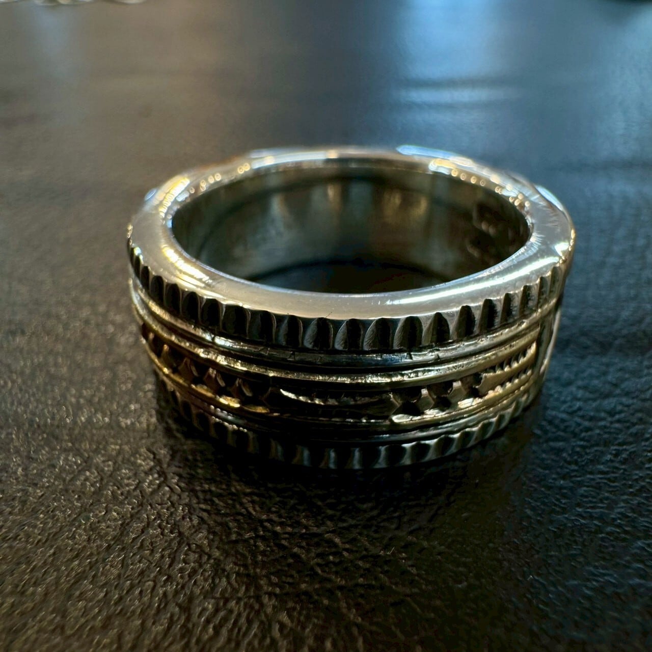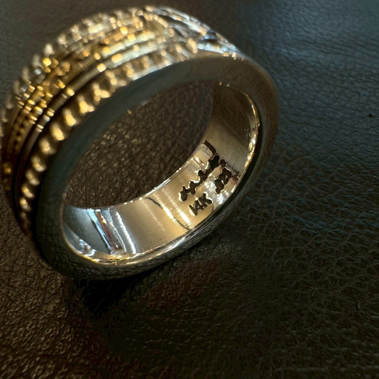 一見シンプルでありながら、目を引くのは圧倒的に美しいスタンプワーク。整然と並ぶ模様は均一なだけでなく、一打ごとに強弱やリズムがつけられており、奥行きのある表情を生み出しています。そこにさりげなく組み込まれた14Kの輝きが、シルバーの重厚感と溶け合い、静かでありながら確かな存在感を放ちます。