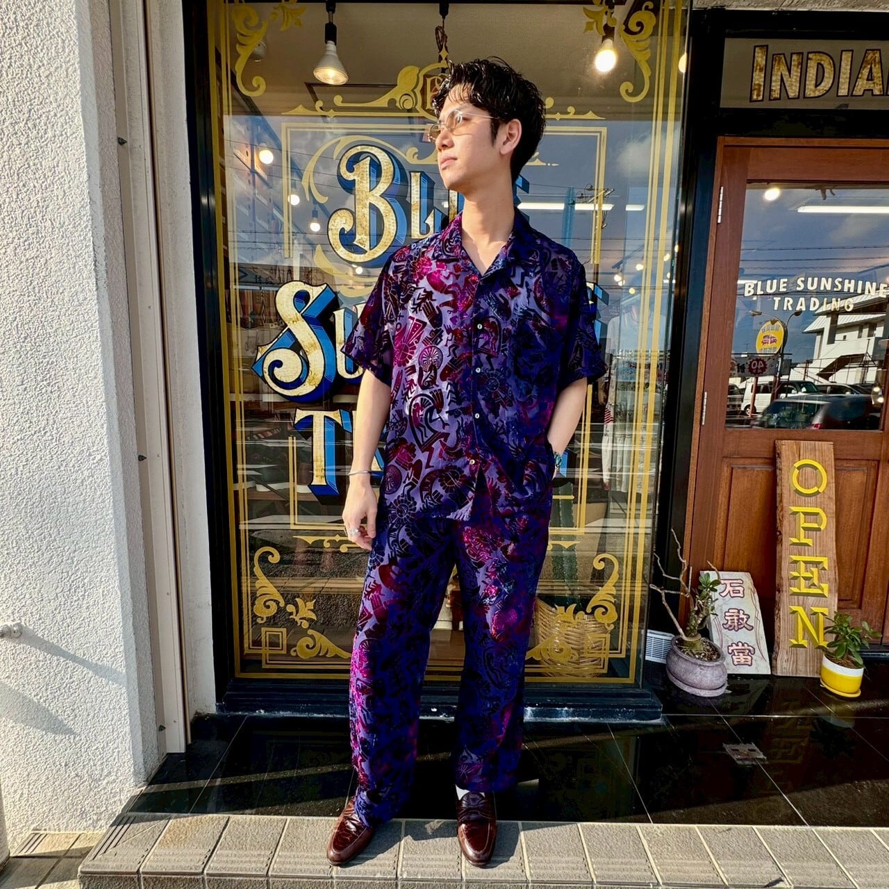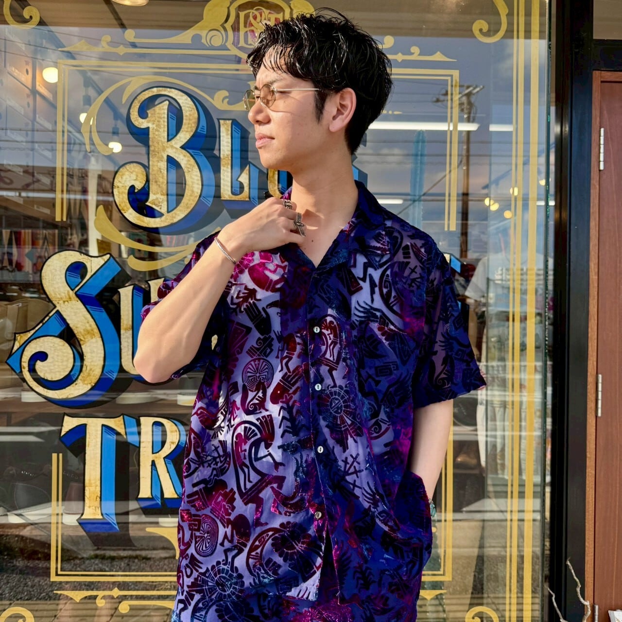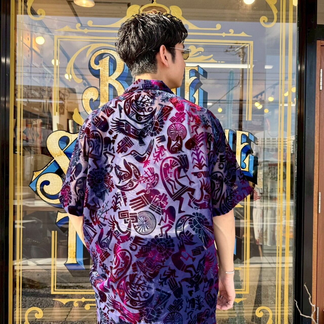 首元はすっきりと開けて、ターコイズのペンダントやインレイリングを合わせるのがおすすめ。柄の中にあるネイティブモチーフとジュエリーが自然にリンクし、統一感のあるスタイルに仕上がります。シルバーのバングルやリングを重ねることで、より奥行きのあるコーディネートに。
