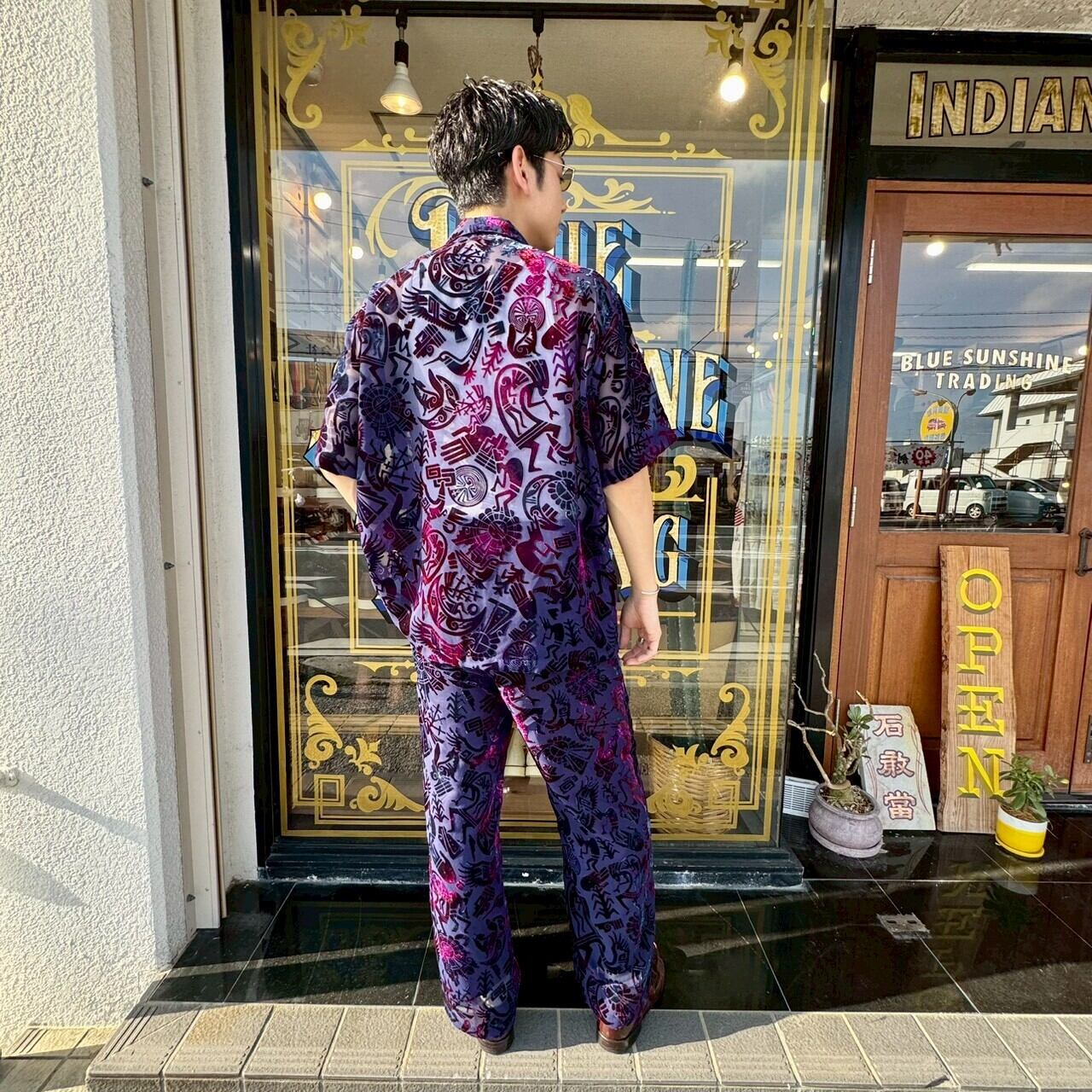 ネイティブアメリカンの中でも、ホピ族が扱うことの多いモチーフをベースにした総柄デザイン。ココペリやサンフェイスを思わせるモチーフが散りばめられ、ストーリー性のある一枚に仕上がっています。