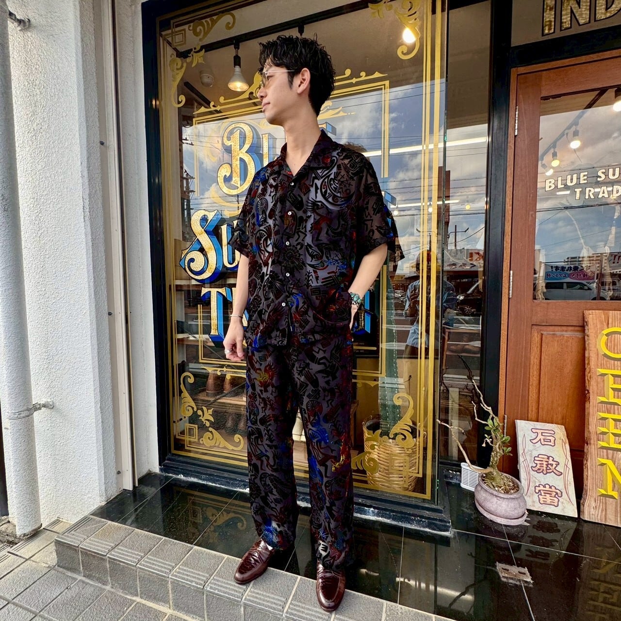 一見インパクトのある総柄ながら、ベースカラーを抑えているためスタイリングに取り入れやすいのも魅力。シンプルなパンツと合わせるだけでコーディネートが成立します。