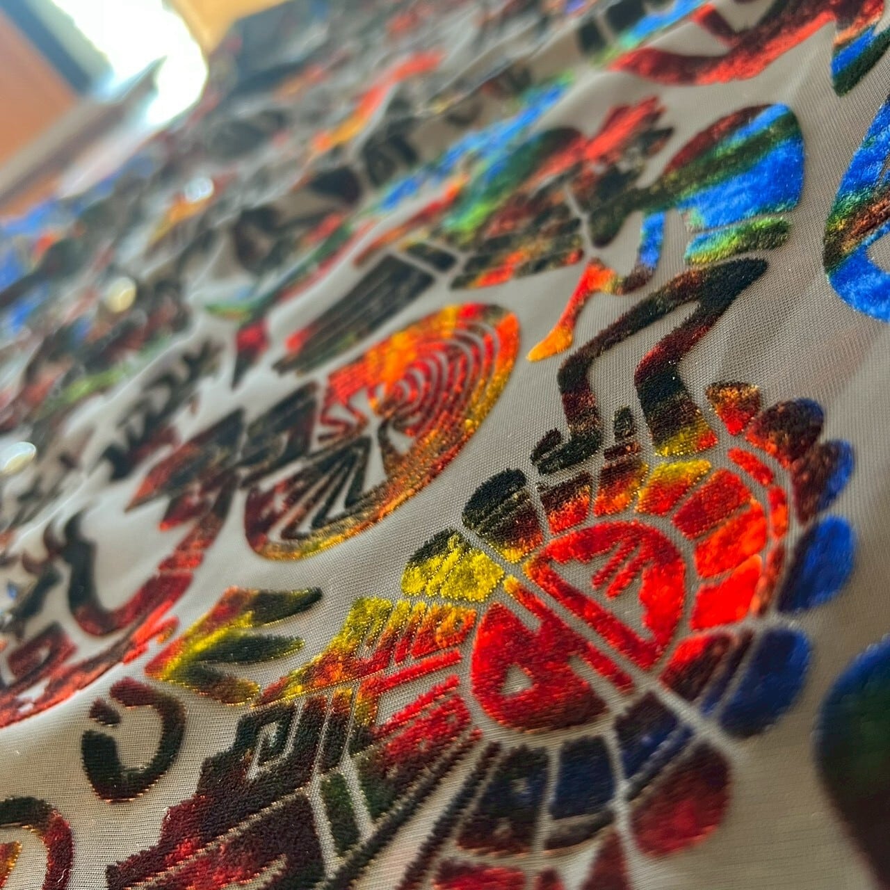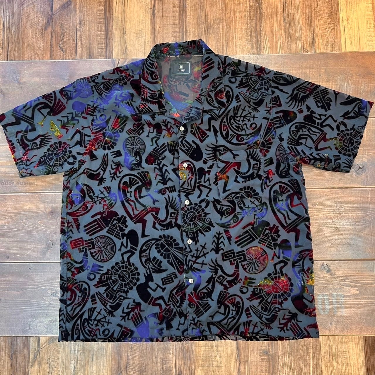 ネイティブアメリカンの中でも、ホピ族が扱うことの多いモチーフをベースにした総柄デザイン。ココペリやサンフェイスを思わせるモチーフが散りばめられ、ストーリー性のある一枚に仕上がっています。