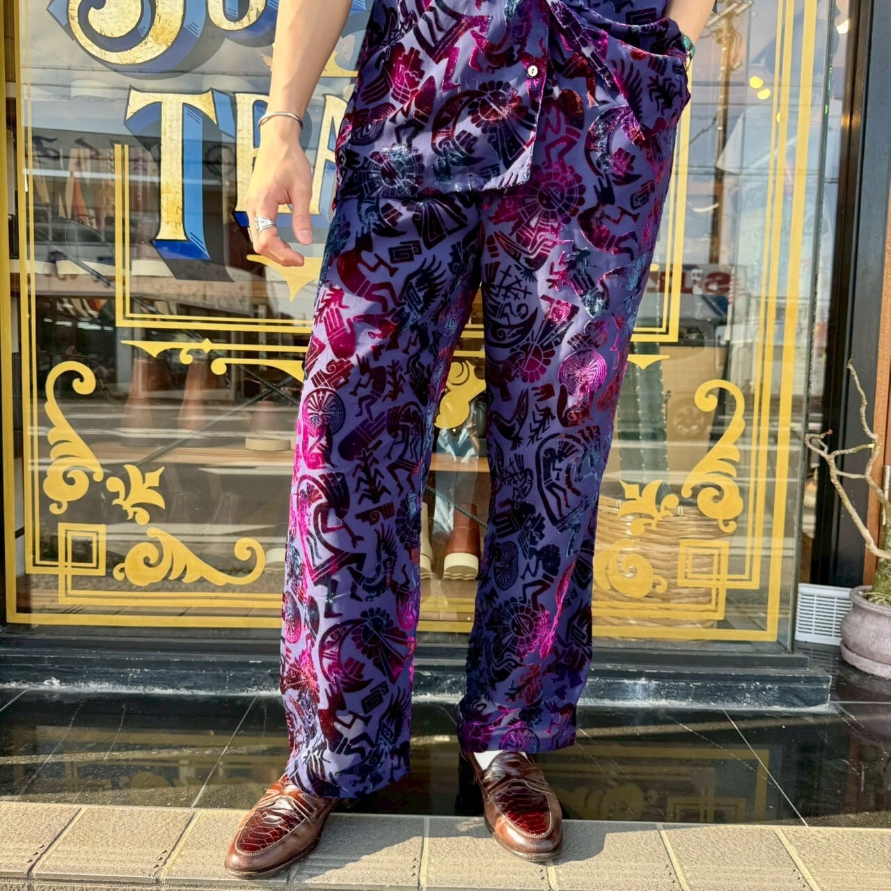 ネイティブアメリカンの中でも、ホピ族が扱うことの多いモチーフを総柄で落とし込んだ一本。ココペリやサンフェイスを思わせるデザインが全体に広がり、穿くだけでスタイルの主役になる存在感を持っています。