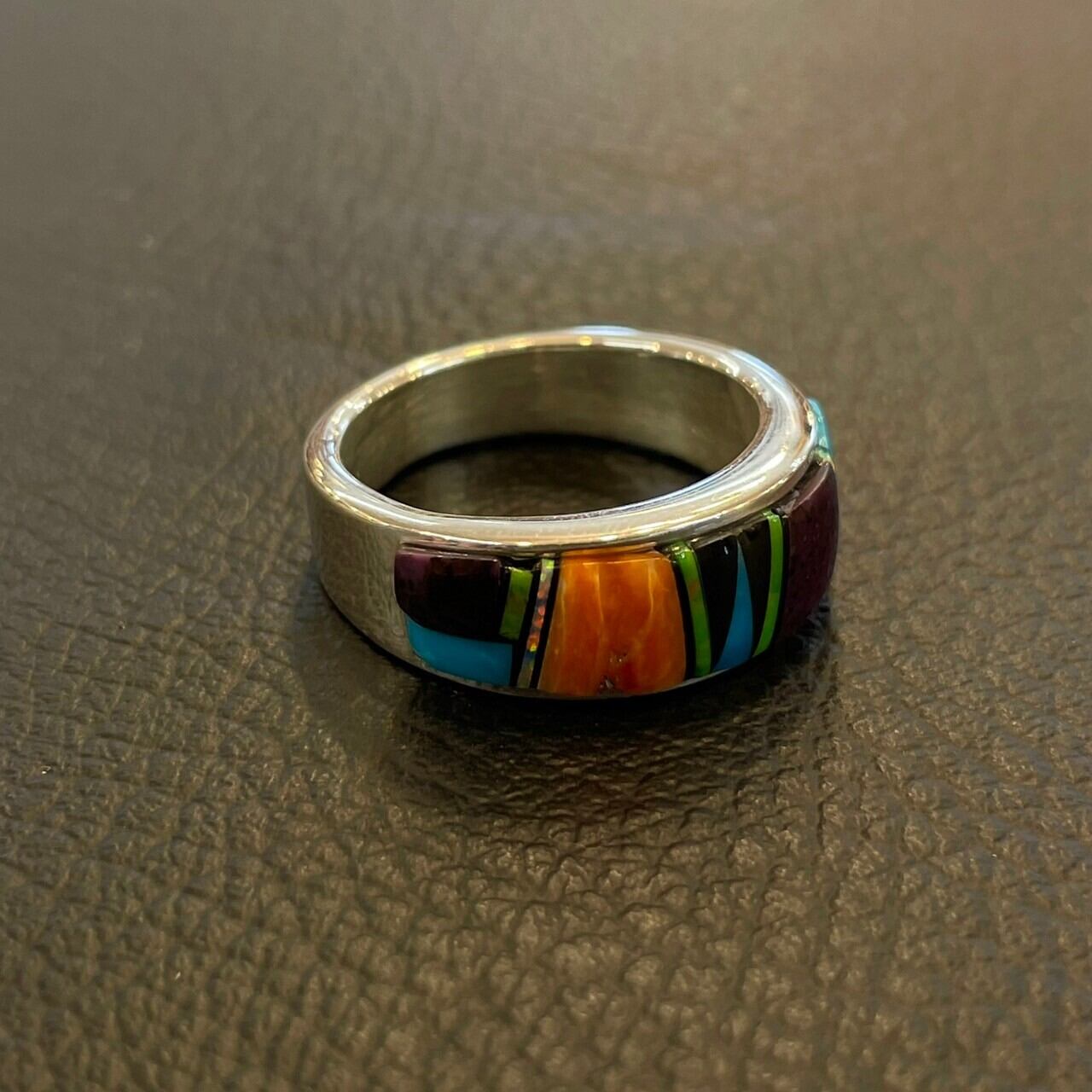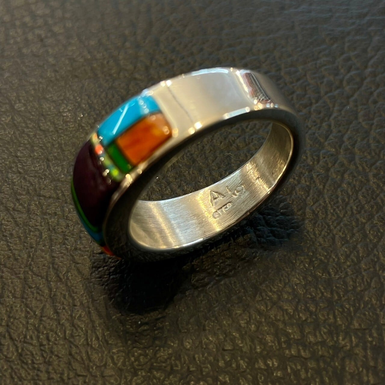 ターコイズや貝殻、その他石などをカットしシルバー枠にはめ込んでいく